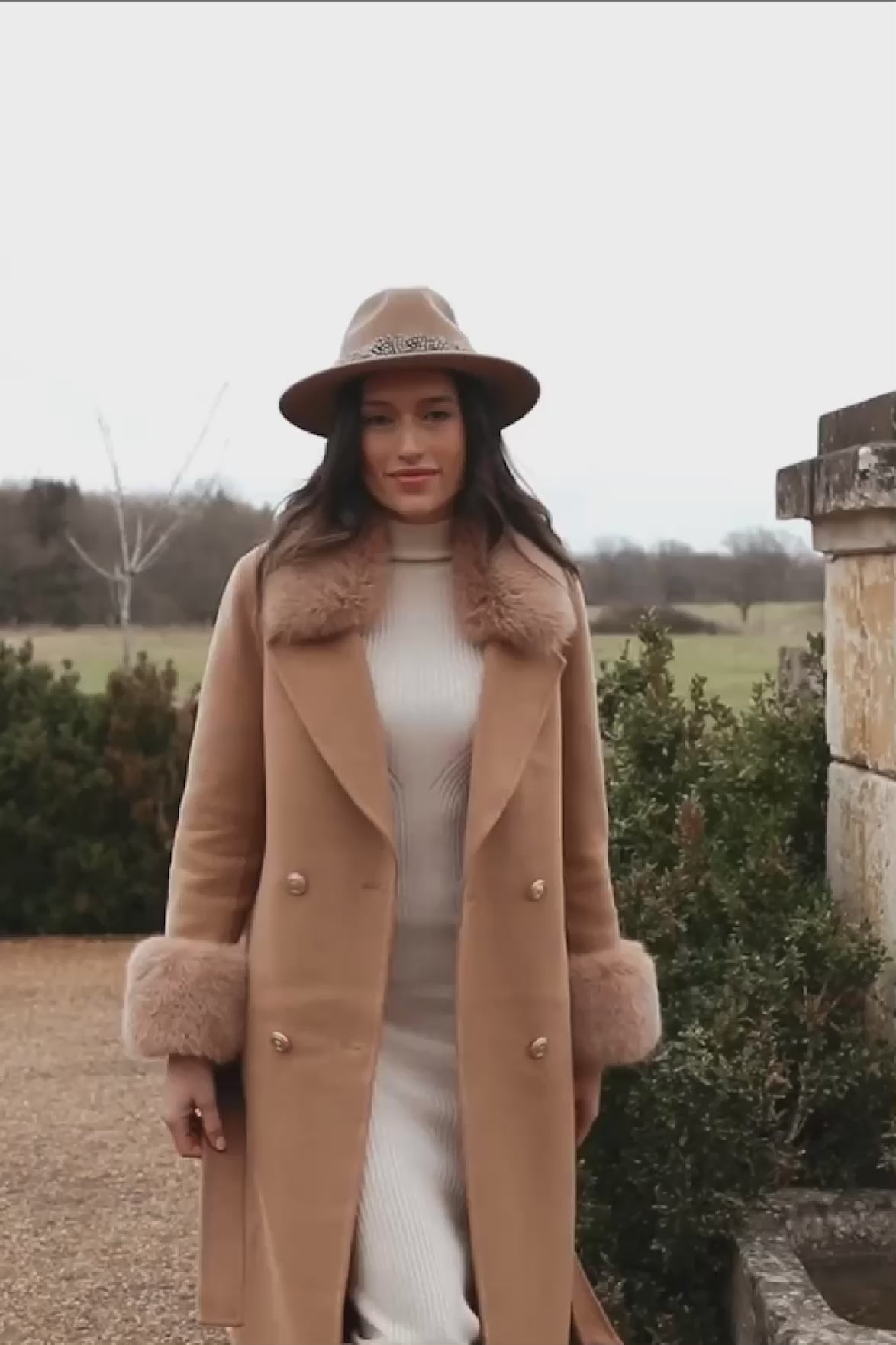 The Buckingham Cashmere Coat in tan is a luxury women's winter coat designed for elegance, warmth, and timeless style. Crafted from premium cashmere-blend fabric, this mid-length coat features a slim fit silhouette that flatters all body types. It includes high-quality, detachable faux fur cuffs that offer a real-fur look without animal products, making it ideal for cold weather and stylish layering.